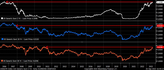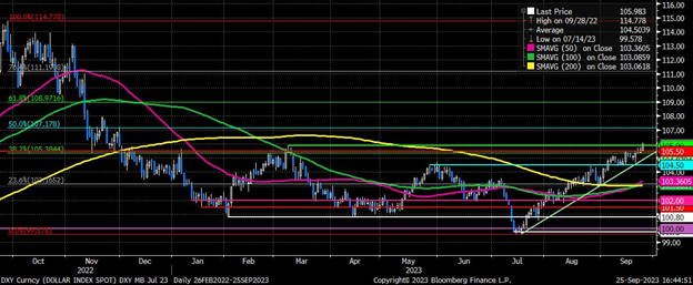 对于外汇市场而言,这一点至关重要,因为这使美联储货币政策委员会(FOMC)能够比大多数G10国家的央行更加收紧政策,同时保持更长时间。最近的“点阵图” 预测明年将仅降息50个基点(仅为6月份预测的一半),这导致市场将首次降息的定价推迟到明年9月,同时国债收益率在各期限内被卖空到多年来的新高,更加熊市陡峭。
