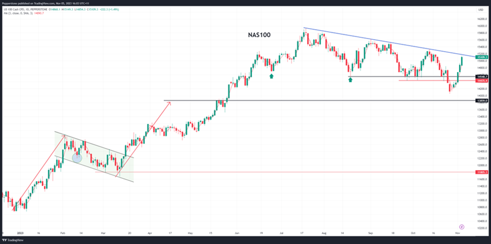 纳斯达克100指数(NAS100)创下了自1月以来的最佳周涨幅,价格关注到15,181点的趋势阻力上。VIX指数下跌6.4个波动率点至14.9%,而高收益信贷利差收窄了39个基点。