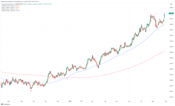 是时候介绍一些更具特色的内容了 – 可可豆市场 。对于那些交易趋势和动量的交易者来说,可可豆是一个值得关注的市场。连续五天的上涨使价格达到了自2011年以来的最高水平。一些人可能会在看到图表后,因为从去年十月以来的异常牛市而考虑开空仓位,但目前这是一个势不可挡的局面,买家掌握着坚实的控制权。