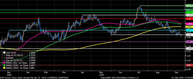 特别是在发布了相当糟糕的“快速”九月PMI数据后,欧元区看起来特别脆弱,尤其是在拉加德两周前宣布的25个基点加息可能会变成类似于特里谢政策错误的另一种版本之后。因此,EUR/USD仍然承压,上周已经跌破了1.0650的5月低点,看空者现在有望将价格送向1.05的关口。