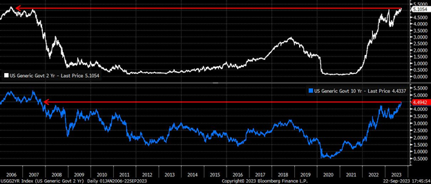 尽管外汇市场依据增长进行交易,但固定收益市场则受到政策预期的影响,而“长期高位” 的信息似乎终于已经被市场接受。上周,国债的收益率创下了新的周期高点,2年期国债收益率达到了2006年以来的最高水平,10年期国债收益率自2007年以来首次超过4.5%。