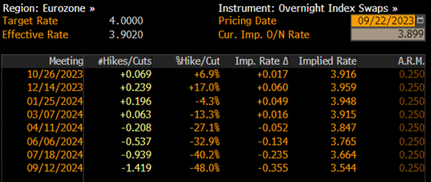尽管市场相对安静,但市场将密切关注最新的德国IFO调查,以寻找欧元区经济面临的进一步下行风险的迹象,此外还将关注9月份的“快速”欧元区通胀数据,以判断本月欧元区是否继续出现通缩。然而,必须指出的是,这些数据发布的政策影响可能相对有限,因为市场普遍认为欧洲央行已经达到了政策的末端,尽管在数据较软的情况下,首次降息的定价可能会提前于2024年7月。