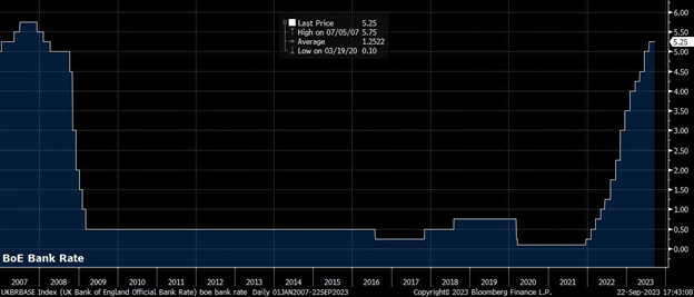 在8月份的通胀报告明显低于预期之后 – 消费者价格指数同比上涨6.7%,核心CPI同比上涨6.2% – 英国央行的货币政策委员会(MPC)以五比四的投票结果,维持了5.25%的存款利率。