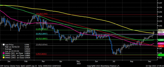 正如前面提到的,瑞士国家银行(SNB)在上周也提供了政策上的惊喜。尽管欧洲央行(ECB)在一周前出人意料地将存款利率上调至4.00%,SNB仍决定将利率维持在1.75%。虽然SNB再次强调了其准备好在外汇市场进行干预的立场,但政策分歧可能会导致瑞郎走软,从而可能进一步推动EURCHF和USDCHF走高,后者现在交投在0.90以上的水平。