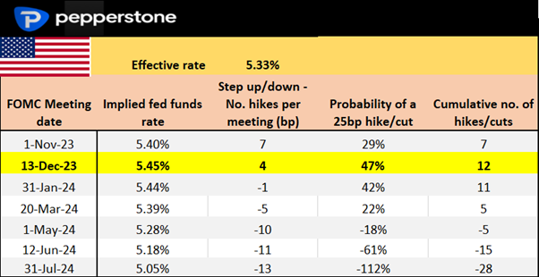 以“3”作为百分比开头的核心CPI将受到市场欢迎,可能导致美元多头回补,从而推高XAUUSD和NAS100。核心CPI达到4.3%以上可能会导致对11月FOMC的加息概率预期上升至约40%(目前为29%),并推动债券收益率上升,从而提振美元的上涨。