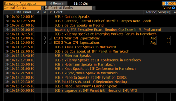 除了美国CPI外,本周将是中央银行的盛宴,美联储、英国央行和欧洲央行官员将在NABE(国家商业经济学家协会)和国际货币基金组织的会议上发表讲话。市场似乎坚信欧洲央行和英国央行的加息周期已经结束,因此美联储官员可能会更积极地影响市场。
