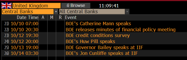 英国央行信贷状况报告(10月12日 19:30AEDT)- 我们将获得英国月度GDP和工业生产数据(均于17:00ASDT公布),这两个数据都预期保持疲软。考虑到最近的抵押贷款批准数据,英国央行的信贷数据可能也会偏低。在利率互换市场基本上认为英国央行的加息周期已经结束的情况下,交易员仍需要关注本周的英国央行演讲。