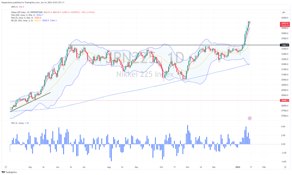 自1月10日以来,JPN225指数的急剧上涨一直吸引着客户的广泛关注,该指数已突破了36,000点大关。快钱玩家纷纷追高该指数,主要是由于疲软的经济数据使得日本银行(BoJ)几乎没有理由放弃其超宽松的政策立场。日本和美国股市之间存在着均值回归交易,在6月至10月期间,JPN225(无论是以日元还是美元计价)表现不佳,美国基金转而看多JPN225,认为其相对表现不佳的程度过头了。从战术角度来看,问题在于是在这里平掉空头头寸以期快速下跌,还是保持观望,等待弱势出现时再买入。在这些水平上建立多头头寸很困难,因为市场走势明显过热,但我们生活在有趣的时代,需要对可能导致市场再次上涨的资金流保持开放态度。