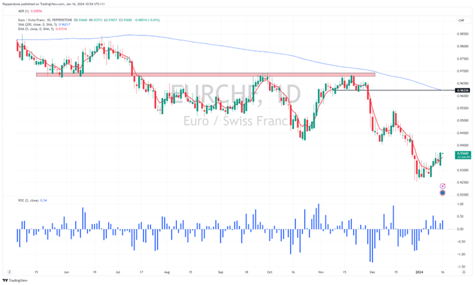 欧元近期表现稳健,相对瑞典克朗(SEK)、日元(JPY)、澳元(AUD)、瑞士法郎(CHF)和加元(CAD)均有显著上涨。推动欧元升值的一个因素是,欧洲央行(ECB)官员组成的协调小组对2024年整年在欧盟掉期市场中定价的降息幅度感到不满。然而,利率市场对欧洲央行的反对尚未进行根本性的重新定价,我们仍然看到市场定价中的共识是欧洲央行将在4月份降息。话虽如此,我们看到欧盟政府债券在相对基础上表现不佳,因此相对收益率差距在收紧,有利于欧元上行。同时考虑到瑞士国家银行(SNB)的外汇储备政策,我们看到CHF在过去5天内是较弱势的货币之一,采取将强势(EUR)与弱势(CHF)结合的动量策略往往是有效的。在0.9270筑底后,我们看到价格形成了一个看涨的外包日 – 多头希望看到价格在0.9375以上继续买入,这将打开通往0.9400/03甚至0.9511的上行空间。尽管本周还有更多欧洲央行发言人出场,但在接下来的交易时段(AEDT 20:00)我们将获得欧洲央行1年和3年的消费者物价指数(CPI)预期,这可能对欧元头寸构成适度风险。