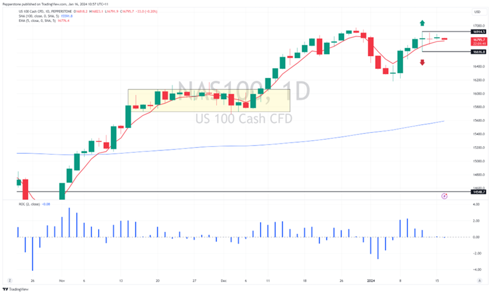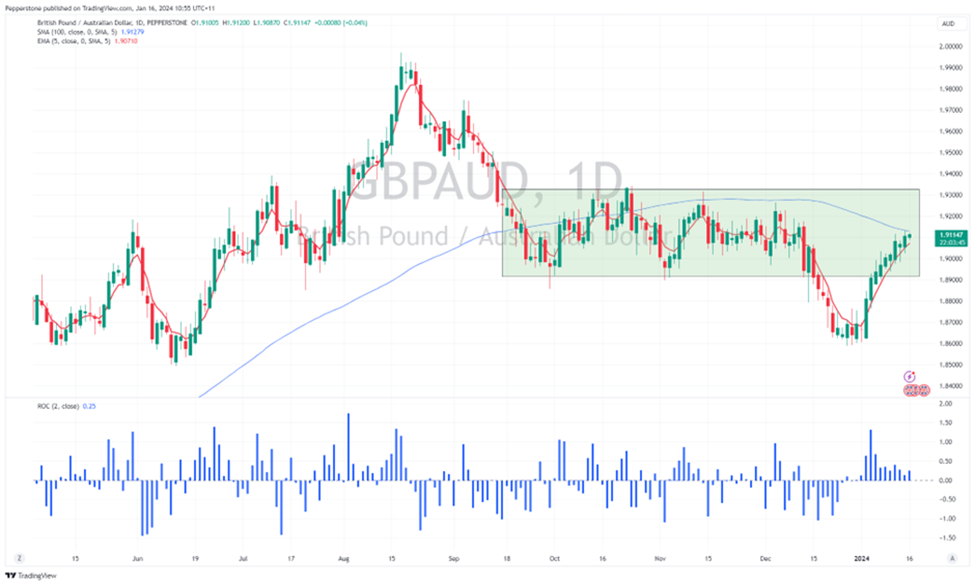 英镑在今年开年表现良好,目前是表现最佳的G10货币。GBPJPY是变动较大货币对,并在各种账户中交易活跃,而日元令许多原本期待日本银行开始正常化进程的人感到沮丧。GBPAUD 也引起了人们的关注,因为我们看到该货币对在过去 11 个交易日中有 9 个交易日收高,并且已回到 10月至12月之间的密集交易区域。目前100天移动平均线正在限制涨势,但一旦突破,我会期待其上涨到之前区间的顶部1.9300附近。英国的就业和工资数据(预计在18:00 AEDT发布)可能对接下来的GBP头寸构成风险,预期周收入增长为6.8%(从7.3%)。明天英国CPI数据也将发布(同样在18:00 AEDT),市场预计核心CPI将为6.1%(从6.3%)。这两组数据会影响英国央行的利率预期,目前市场预计首次25个基点降息将在5月进行,到2024年12月总共降息5次 – 考虑到我们还会在接下来的交易时段听到英国央行行长Bailey的讲话,我们将寻找对英国利率定价的反对迹象。