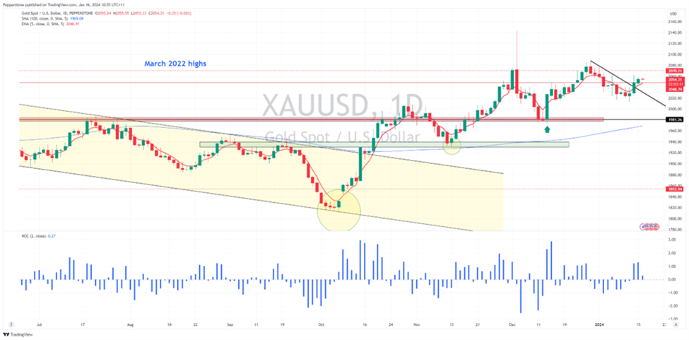 由于马丁·路德·金纪念日美国现金债券市场休市,黄金和外汇市场缺乏方向性,但这将在接下来的交易时段发生变化,届时圣路易斯联储行长Waller将就美国经济展望和货币政策发表讲话(AEDT 03:00)。回想一下,Waller在推动美国股市上涨方面发挥了重要作用,他在11月28日提出了一条明确的路径,联储可能在通胀按预期运行的情况下降低联邦基金利率。我们知道Waller关注的是6个月年化通胀率,鉴于美国核心CPI在3.2%水平,核心PCE通胀率在2%左右,Waller应该会保持这样的观点,即如果这一趋势持续,联储可能会放松政策。对于做多黄金和NAS100/做空美元来说,风险在于他可能对市场就3月降息的定价表示反对,并显示出缺乏政策正常化的紧迫性。也可能有人期待他进一步讨论调整其量化紧缩(QT)计划的时间表。这就是说,如果他甚至在一定程度上确认市场定价,那么我们应该看到美国2年期国债收益率进一步下降,美元可能走低,黄金则可能回到12月28日的2088美元高点。当然,随着下降趋势的打破和动量研究转向看涨,目前的布局对黄金多头来说更为有利。