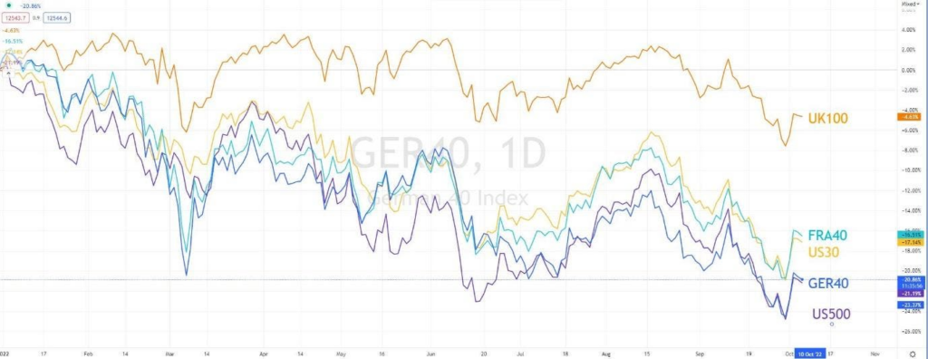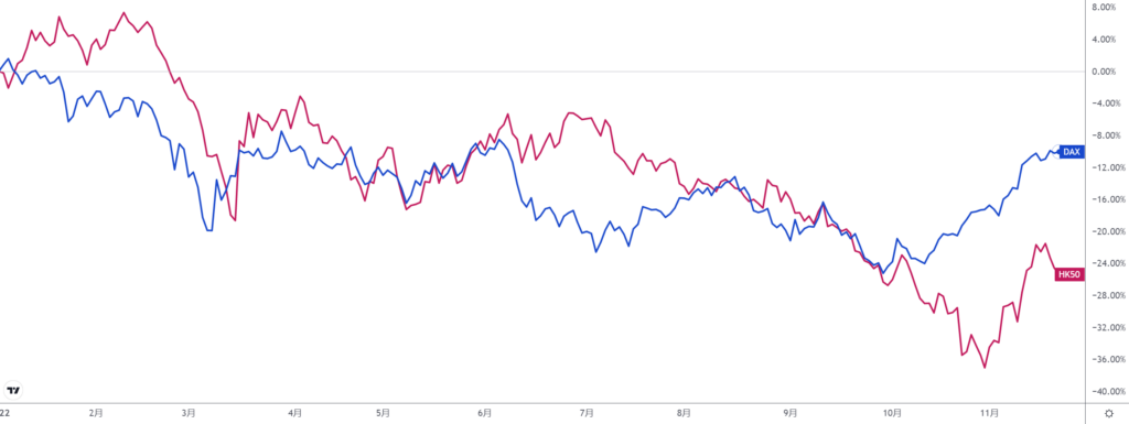 当这种指数相关性过度扩大时,还可以通过不同指数的互相反向交易进行套利投机。如下图所示,在10月底之前,全球主要股指都是下跌的态势。但是黄色的UK100英国富时100指数的跌幅明显小于DAX40指数。此时卖出DAX40指数期货,买入UK100指数期货就是套利的一个明显案例。