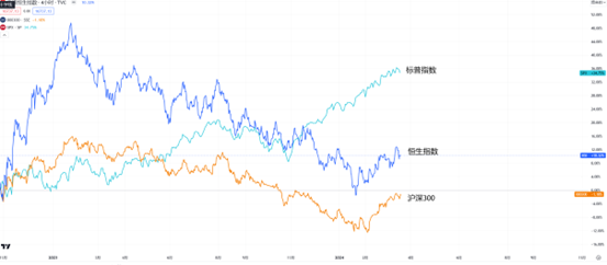 究竟香港股市近期受国内影响大还是国际市场影响大呢?有图有真相,可以在Tradingview当中添加多个产品到绘图窗口进行对比。橙色线段是沪深300指数,淡蓝色线段是标普500指数,深蓝色是恒生指数。