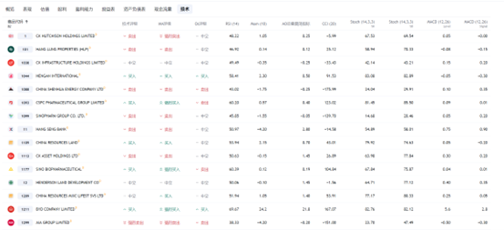 在Tradingview当中,在股指的详情页面,可以查看到恒生指数的成分股,还可以通过“估值/盈利能力/股息/现金流量/技术指标等对成分股进行排序筛选。