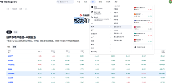 从板块来看,年初至今,港股上的能源矿产,配送服务,消费者服务涨幅居前。投资者可以在TradingView市场菜单中选择股票—板块和行业进行查看。