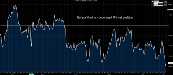 许多人关注每周交易者承诺(CoT)报告,我们在该报告中看到非商业账户持有的日元头寸处于多年净空头状态。我们还看到一些 78,000 日元期货合约的杠杆社区净空头仓位变动更快——这是 2018 年以来最大的净空头仓位。