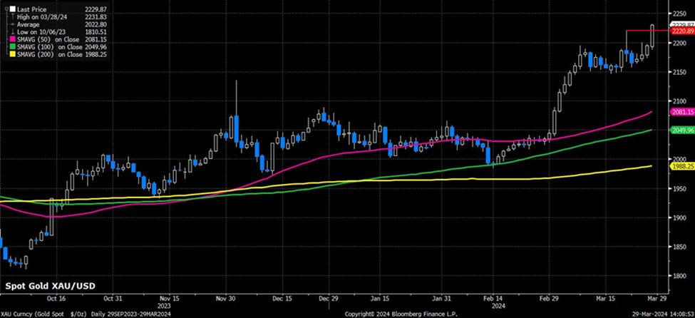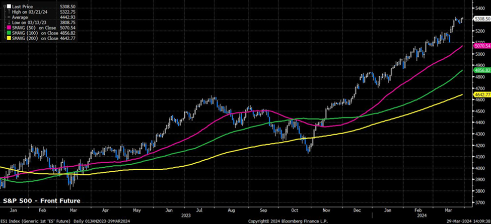 从更广泛的角度来看,标普500指数和纳斯达克100指数目前已经连续五个月上涨,2024年第一季度也标志着这两个指数连续第二个季度上涨。鉴于前述的支持性政策背景,股市可能从这里进一步上涨,而从4月12日开始的2024年第一季度财报季将是股票市场的下一个重要考验。
