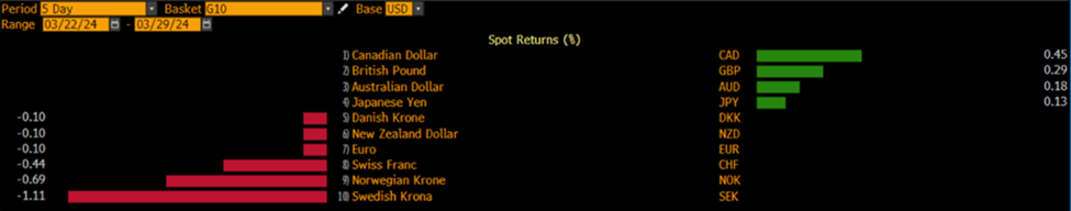 话虽如此,欧洲各国央行越来越倾向于鸽派,因为对美联储前景的风险更明显地偏向鹰派。例如,上周瑞典央行的决定指出,5月可能会进行首次25个基点的降息,而瑞士央行已经在本轮周期实施了 G10 的首次降息,同时有关5月英国央行降息的传言也越来越多。因此,预计欧洲货币(EUR、SEK、CHF、GBP)在未来一段时间内将继续相对疲软地对美元交易。