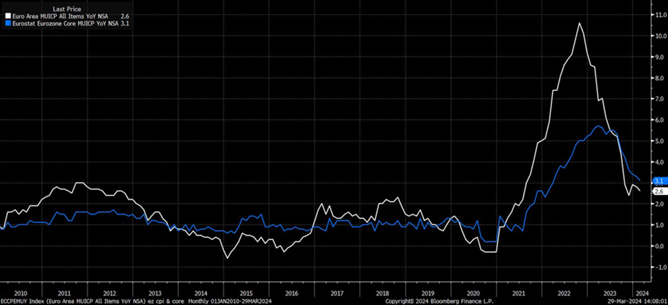 同样是欧元区,最新的广义通胀数据将于周三公布,预计3月份的“快报”数据将显示广义CPI年同比增长从之前的2.6%放缓至2.5%,而核心指标应该会降低0.1个百分点至同比增长3.0%。与预期一致或更冷的数据将进一步巩固6月份降息的情况,尽管此类结果已经被欧元OIS完全定价。