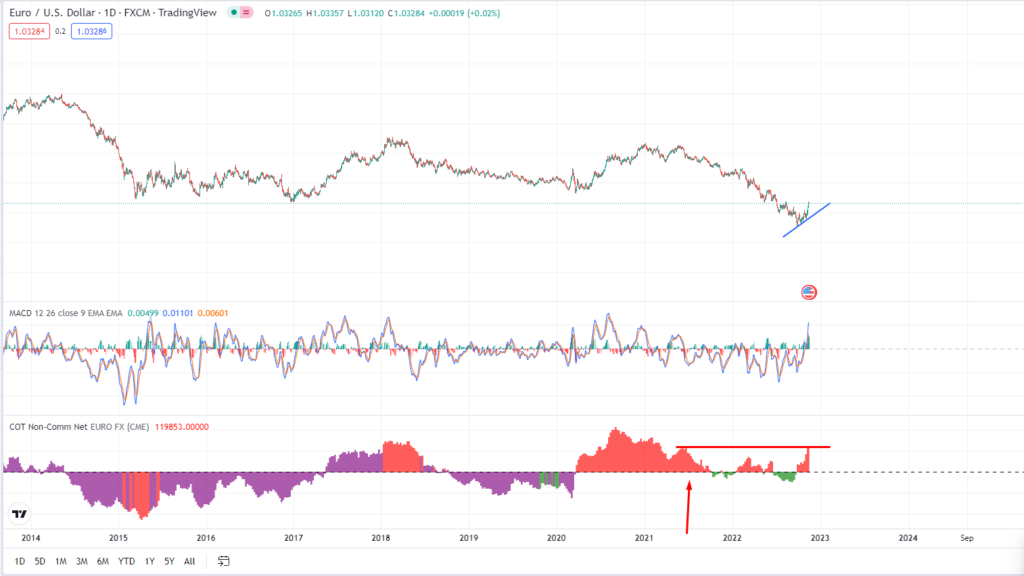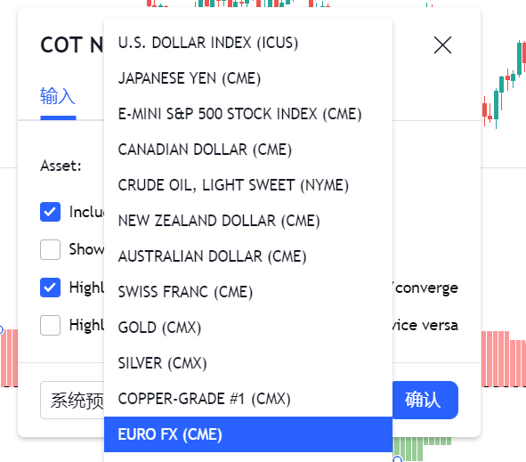 可以利用TradingView平台上添加Noncommercial Net Position指标,并将Asset设置为EUROFX就可以直接在走势图当中添加持仓数据。