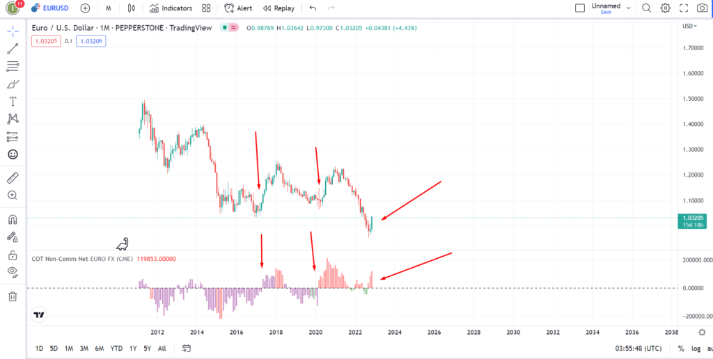 类似当下欧元兑美元下跌的反转局势也曾在2020年年初和2017年年初出现过。下图可见,随着COT的净多头头寸仓位的持仓增加,最终逆转了欧元兑美元的下跌趋势。