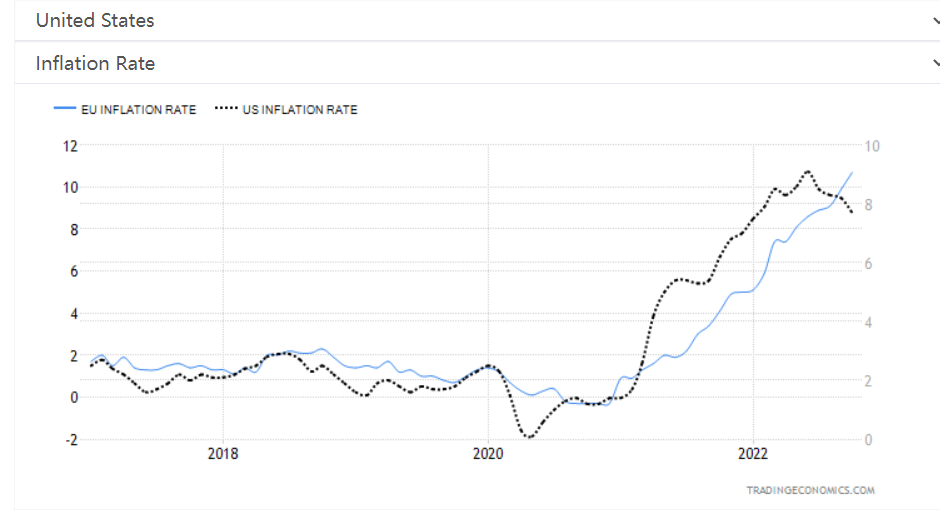 通胀上的数据走势差异也给欧元兑美元的反转埋下了伏笔。要知道无论是欧央行还是美联储,货币政策的目标都包含了维持物价稳定。现在都处于高通胀水平,但是问题是对于这两个央行而言,自己地区内的通胀水平是否到了拐点?2022年10月欧洲的通货膨胀率录得10.7%,远高于欧央行目标通胀值2%,且没有拐头向下迹象。这背后是新冠疫情后对经济恢复的需求、粮食价格的上涨、供应短缺以及之前欧元大幅贬值带来的输入性通胀导致的。