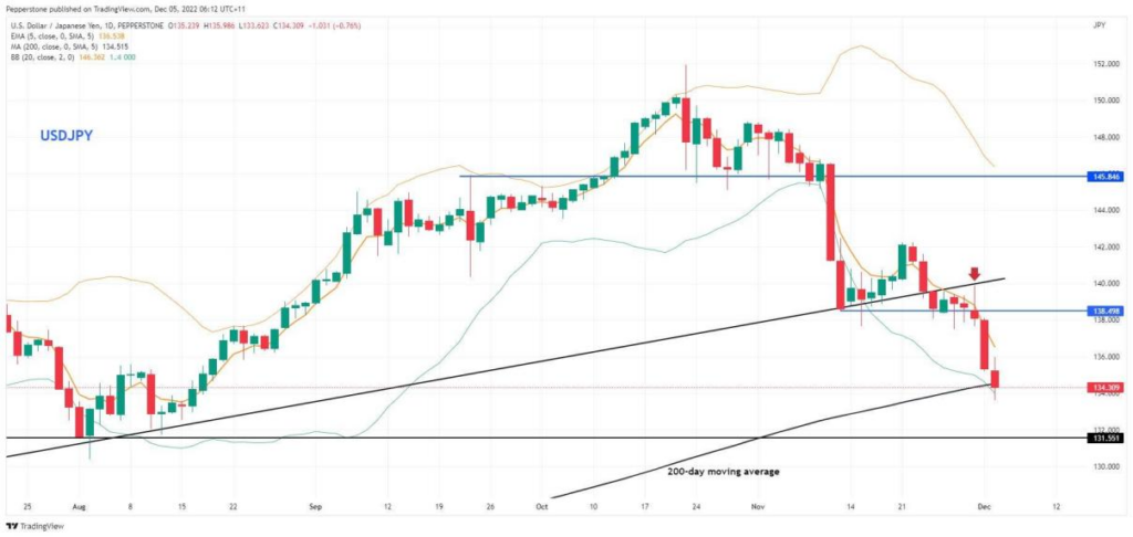 在实际利率下降的情况下,直盘货币对中的日元兑美元(反向表示)以 3.6%的最高涨幅占据上周非美货币反弹榜首。2023 年,日本央行政策立场的变化可能会对日本和全球债券市场产生巨大影响,这其中就包括美元兑日元。美元兑日元在11月之后出现了大幅下滑,目前触及 200 日均线。在这样重要的均线附近(可以参考100日均线)往往会出现小范围反弹再出现跌破。由于美元指数的总体转向,美元兑日元极大概率结束一轮牛市。