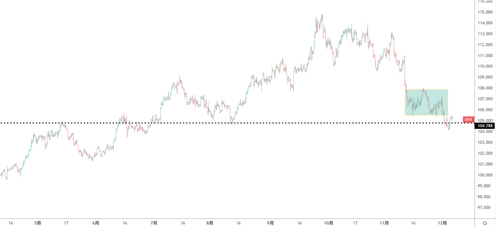在这种状况下,不少投资机构认为美元的牛市早已结束,而加息周期即将结束。法国兴业银行认为美联储比大多数机构都更接近加息周期的尾声。在经济软着陆、货币政策转向和能源价格下跌的背景下,美元指数将逆转其在2022年1月至9月期间的大部分涨幅。结合这一看法,可以发现美元指数四小时图中,价格再次触及105.497的支撑阻力转化位置,预计多头仍将在104-105附近继续垂死挣扎。