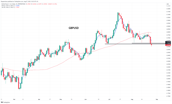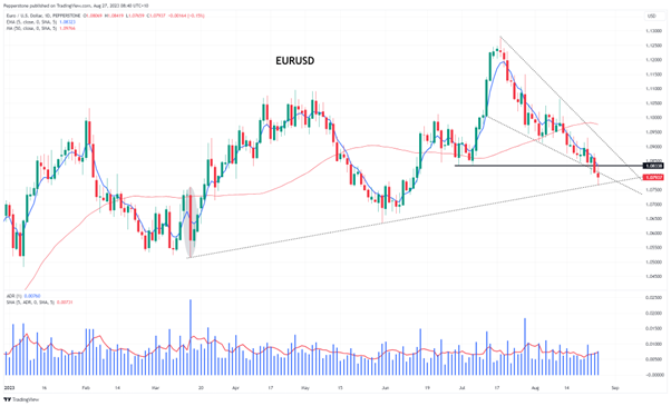 欧元区 CPI(8月31日,19:00 AEST) – 市场预计欧元区广义通胀率将从5.3%下降至5.1%,核心CPI预计从6月的5.5%下降至5.2%。市场认为9月14日的欧洲央行会议将面临9个基点的加息(36%的概率),并且预计到12月会加息18个基点 – 这次的欧元区CPI数据可能会影响这种定价。EURUSD在趋势支撑位上找到了买家(自3月低点),但在我看来,反弹应该被卖出 – 存在着EURUSD可能走向5月低点(1.0635)的实际风险。