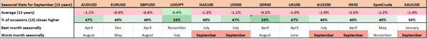 月末资金流动 – 月末的再平衡资金流动可能会影响本周的价格走势,卖方银行表示这些资金流动可能会支持美元。展望未来和季节性因素,在过去的15年里,9月是美国500指数、纳斯达克100指数、澳大利亚200指数、恒生50指数和黄金回报最糟糕的月份。美元指数则在过去6个连续的九月份中均有反弹。让我们看看当重要的市场参与者回到交易台,过去的表现是否能在这一次度过美国、欧盟/英国的夏季假期后为我们提供指导。