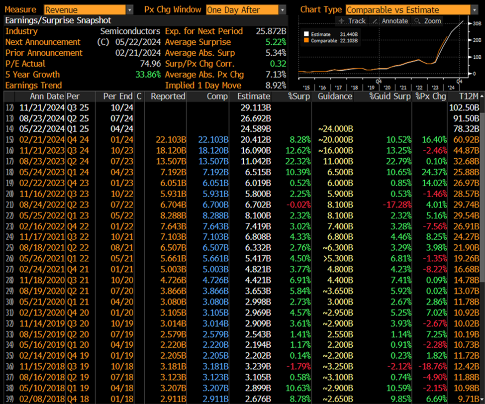 期权市场对财报发布后第一个交易日(即5月23日)的涨跌幅预期为-/+8.9%,如果定价正确,从当前水平来看,这可能会导致股价创下新的历史高点,或接近$820美元。当前市值为2.26万亿美元,8.9%的波动将意味着市值增减约2000亿美元,这基本上超过了纳斯达克100指数中82家公司的市值。