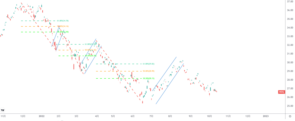 在 2022 年的大部分时间里,美国科技行业一直面临压力,净跌幅超过 -29%。全球股市主流股市的表现在低经济增速,高通胀,高利率背景下都比较糟糕。尤其是更积极的美联储利率政策最近加速了这一举措。 从技术分析当中,今年这一纳斯达克100指数的ETF走势十分有特色。中期下跌之后,均反弹至前期波段的50%至61.8%附近,然后再度创新低。