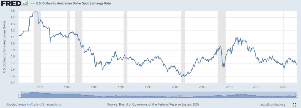 新西兰经济状况也和澳大利亚类似,因此澳元和纽元被称为商品货币。当全球处于经济上行阶段且美元处于弱势时,澳元和纽元会由于出口原材料而上涨;当经济衰退期间由于大宗商品价格暴跌使得澳元和纽元贬值,如果再叠加因避险需求导致的强势美元,那么AUD/USD NZD/USD将大幅下跌。在澳元兑美元的40年历史走势图中,可以看出2000-2007年 2009-2011年和2020-2021年这三段大宗商品牛市时,澳元兑美元呈现上涨为主的趋势。