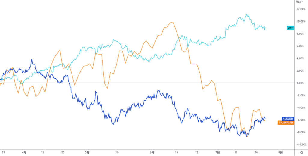 (蓝色-澳元兑美元;黄色-CRB商品指数;绿色-美元指数)