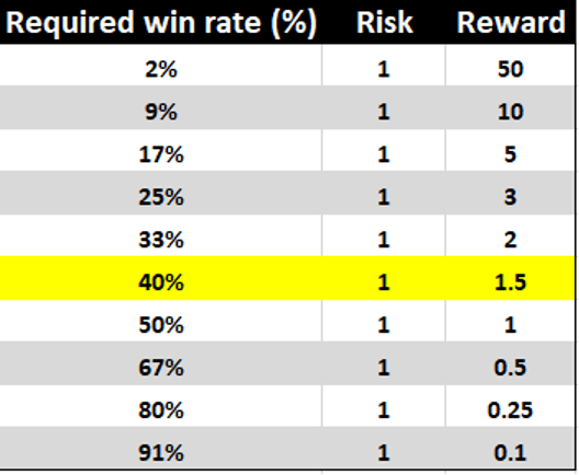 这种回报变化取决于策略—如剥头皮可能以高赢率为目标,但回报/风险的比例很差。趋势和震荡短线交易者(持仓4小时之内)可能专注于实现大于1.5 倍 回报/风险的比例,但只有35%到40%的胜率。无论哪种方式,了解自己的风险是关键。