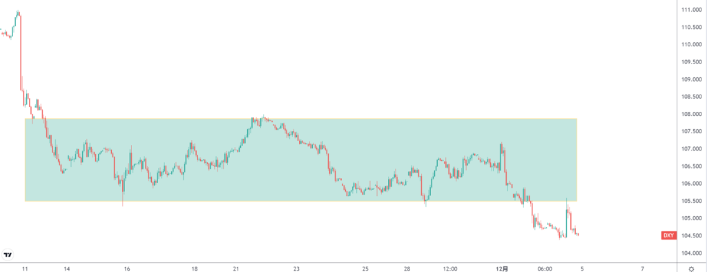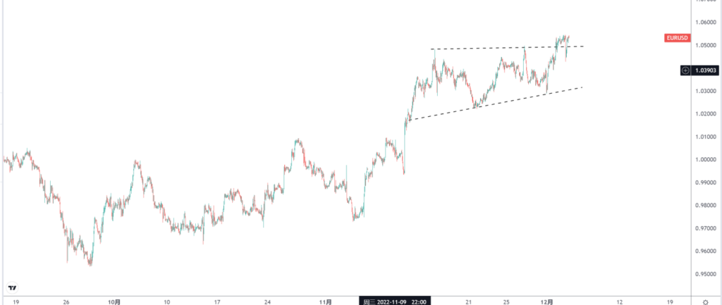 美盘收盘之后,美元指数几乎完全回吐了非农数据带来的涨幅。跌破104.50。甚至出现了在小时图级别当中的回踩阻力位并继续下行的迹象。美元指数在12月份当中依旧会按着上周文章所述的运行逻辑进行,即”市场已经从高通胀导致加速升息的逻辑切换为通胀下跌,经济预期下行的由盛转衰的逻辑。由此看来,一切皆有通涨升,一切也将皆由通胀落,这背后或许就是逃不开的周期。“