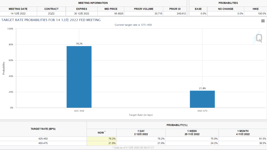 下一次美联储议息会议将在12月15日公布,目前市场预期有78.2%的概率加息50个基点至4.25%~4.50%范围;有21.8%概率加息75个基点至4.50%~4.75%范围。加息50个基点概率与一个星期前相比甚至略有上升。