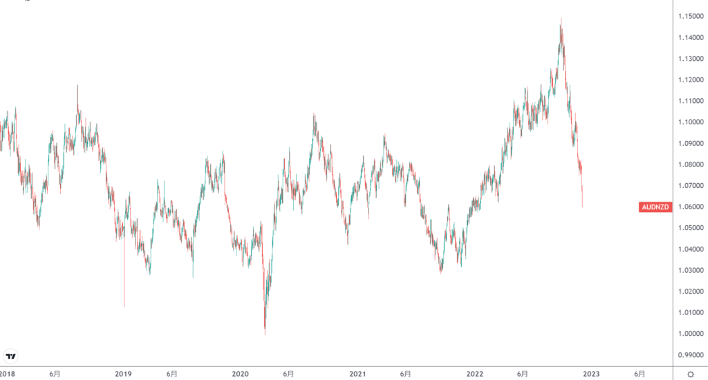 本周较为重要的事件还有12月6日的澳联储利率决议,预计澳联储仅加息25基点并且是这轮加息周期的最后一次加息。但是隔海相望的新西兰的央行仍在保持较快的加息速度。11月的会议上新西兰央行加息75基点,澳大利亚却只加息25个基点。同为大洋洲国家,如此明显的加息步伐差异推动澳元兑纽元走低。走势图上该品种呈现令人吃惊的下跌速度,几乎没有任何反弹的下跌令人很难预计这一货币对的下一个目标在何方。