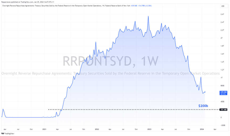 越来越令人担心的是,如果RRP余额降至2000亿美元以下,可能会开始在市场融资利率方面引起真正的压力。正如我们在2019年看到的,这可能对整体市场情绪产生显著的负面影响。