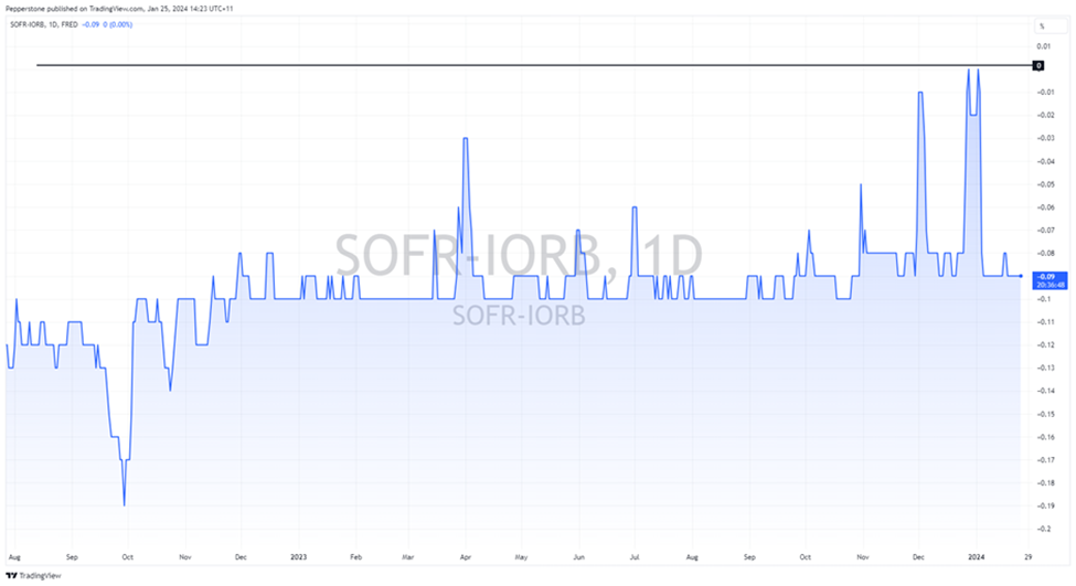交易员可以通过在TradingView上使用代码FRED:SOFR-FRED:IORB进行监控 – 如果这一指标上升超过0基点,尤其是超过10基点,将引起极大关注。