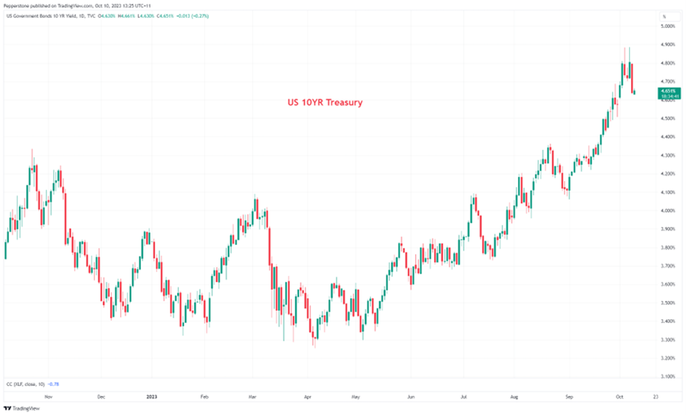 毫无疑问,众议院将在本周或下周投票选举新的议长——填补这个职位的紧迫性确实很大,以至于一些人甚至提出Kevin McCarthy至少在短期内重新担任该职位。我怀疑这个可能性非常小。Steve Scalise被认为是获得这个职位的最有可能人选,这对风险来说应该是中性的。然而,如果司法委员会主席(和超级财政鹰派)Jim Jordan能够出人意料地当选,那将极大地增加政府关门的可能性,同时也会使黄金成为对高度混乱的国会的避险工具——即使其影响受到工人返还工资的限制。