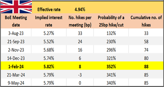 市场和经济学家预计加息 25 个基点的可能性较高,预计到 2024年2月利率峰值将达到 5.83%。换言之,未来英国加息还会持续好几个月,每次利率会议都存在不小的加息可能性。