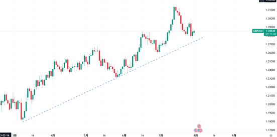 目前市场预计9月14日举行的下一次欧洲央行会议加息的可能性为40%。综上所述欧元兑美元的走势或仍在相差不大的货币政策预期下摇摆,蜻蜓点水般的快速小幅上涨行情很难出现,关注近期趋势线或者支撑位显得更为现实。