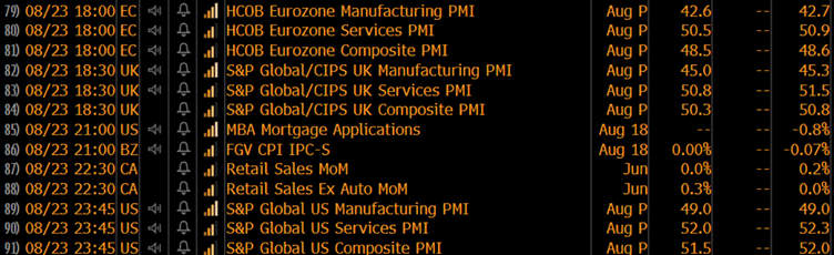 - 澳东时间8月23日晚上6点发布的欧元区制造业和服务业PMI,目前预测值都比前值略低。而低于50的数据可能会引发欧元的卖空行情。