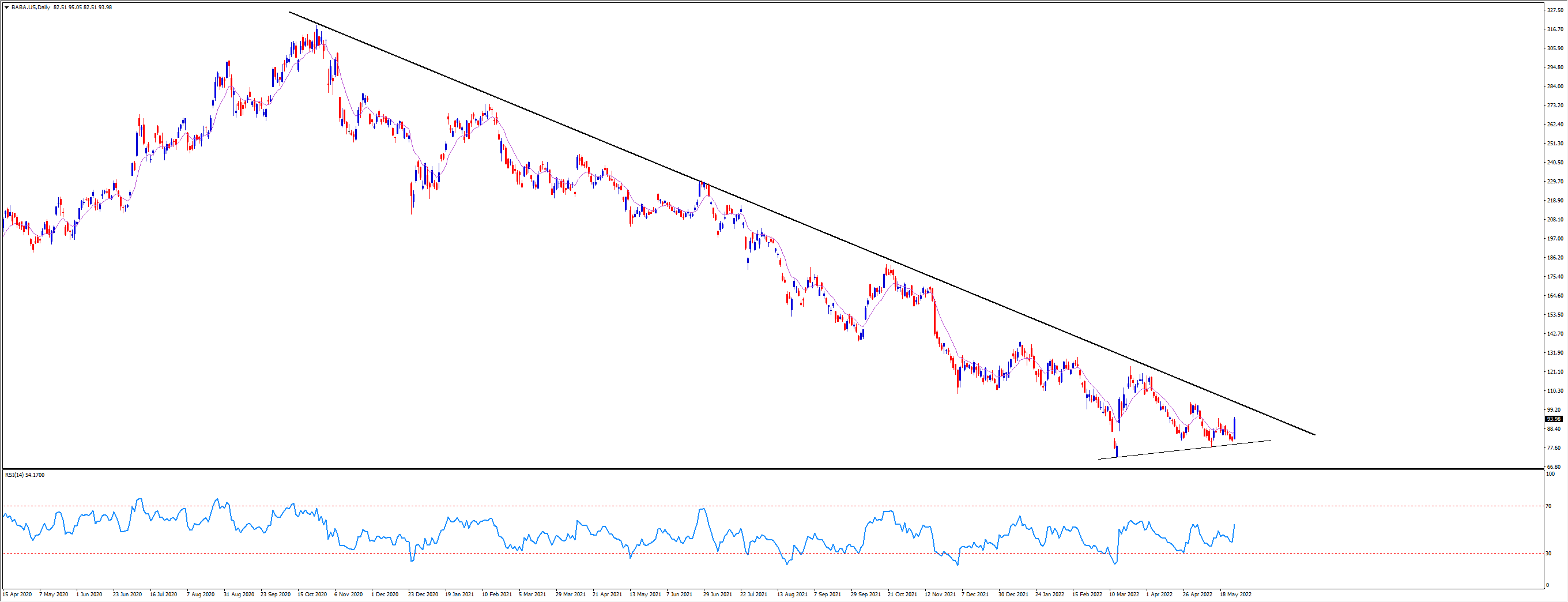 昨天的股价可能更多体现的是一种长期积压的负面情绪的释放,毕竟从2020年10月的高点以来阿里巴巴的股价已经累计下跌了70%。如果能冲破下降趋势线的压制(102附近),才有可能真正扭转长期以来的颓势。