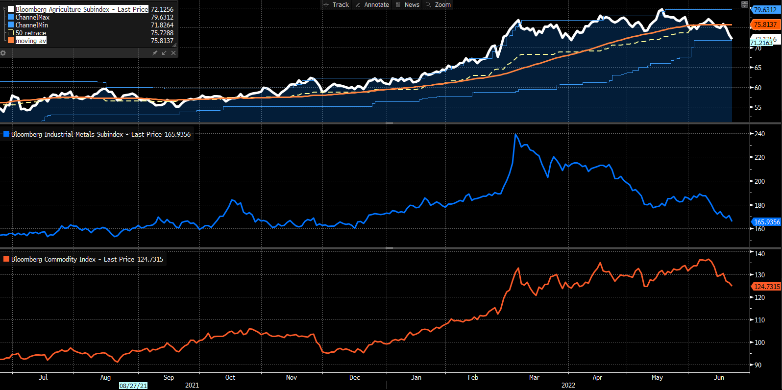 下图显示,彭博工业金属分类指数(蓝色)从今年3月就开始了下行趋势,而农产品分类指数(白色)在5月见顶。进入6月份后随着能源的高位回调,彭博大宗商品指数(橙色)也不可避免的出现了下降的迹象。