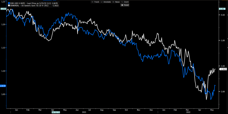同样收窄的还有欧美利差。下图显示德国和美国的10年期实际利率的利差(白线)已经升至-1.5%。以此为参照,EURUSD(蓝线)应该还有进一步上升的空间。