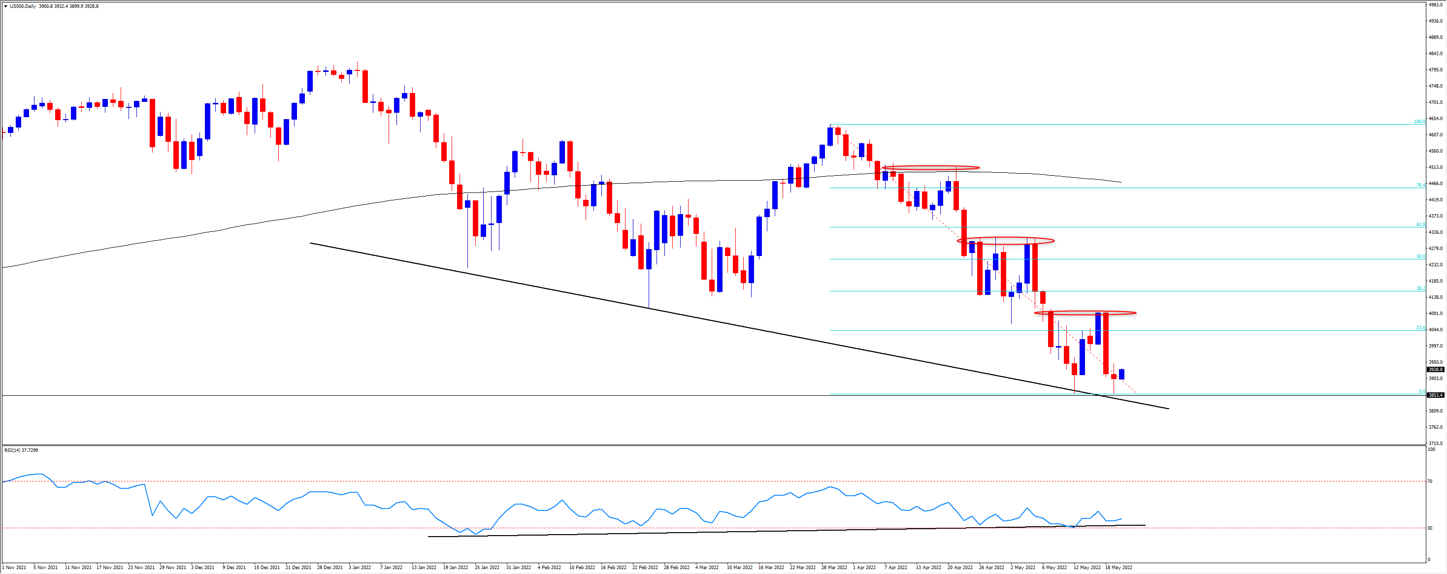 从标题普(US500)的日线图上来看,3858是5月中旬两度触及的低点位置,形成了双底,这里也是股指20%回撤的点位,即理论上的牛熊分水岭。若下行,关注200周均线所在的3480一线;上行方向阻力较多,可以关注一系列的前高位置。