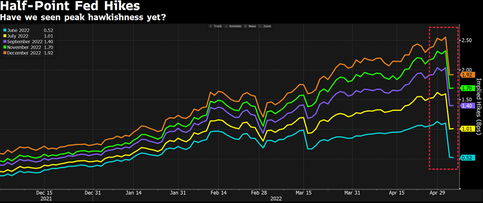 加息50个基点并从6月开始启动缩表的决定完全符合市场的普遍预期。而对于投资者更为关注的加息路径预期,鲍威尔基本排除了未来几次会议上加息75个基点的可能性,这让此次的利率决议看上去略带那么一些“鸽派”。