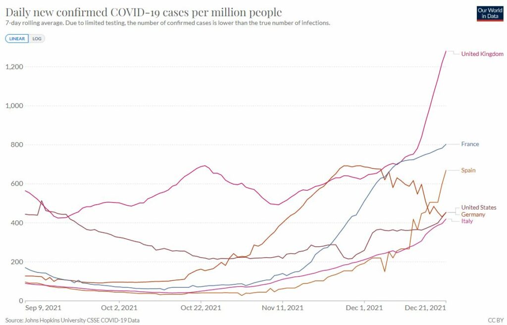 这种极度分裂局面的背后,除了有欧美同胞们对数字和防疫的麻木外,更多还是源自于辉瑞最新获得紧急授权的治疗药物和对Omicron病毒的最新研究结果。南非和英国的学者认为Omicron引发的住院率要比Delta低很多。若真如此,“新冠流感化”并非不可能。在新冠即将进入第三个年头之际,人们显然更愿意相信或者期待“隧道尽头的光”,而忽略那些冰冷的数字和线条。